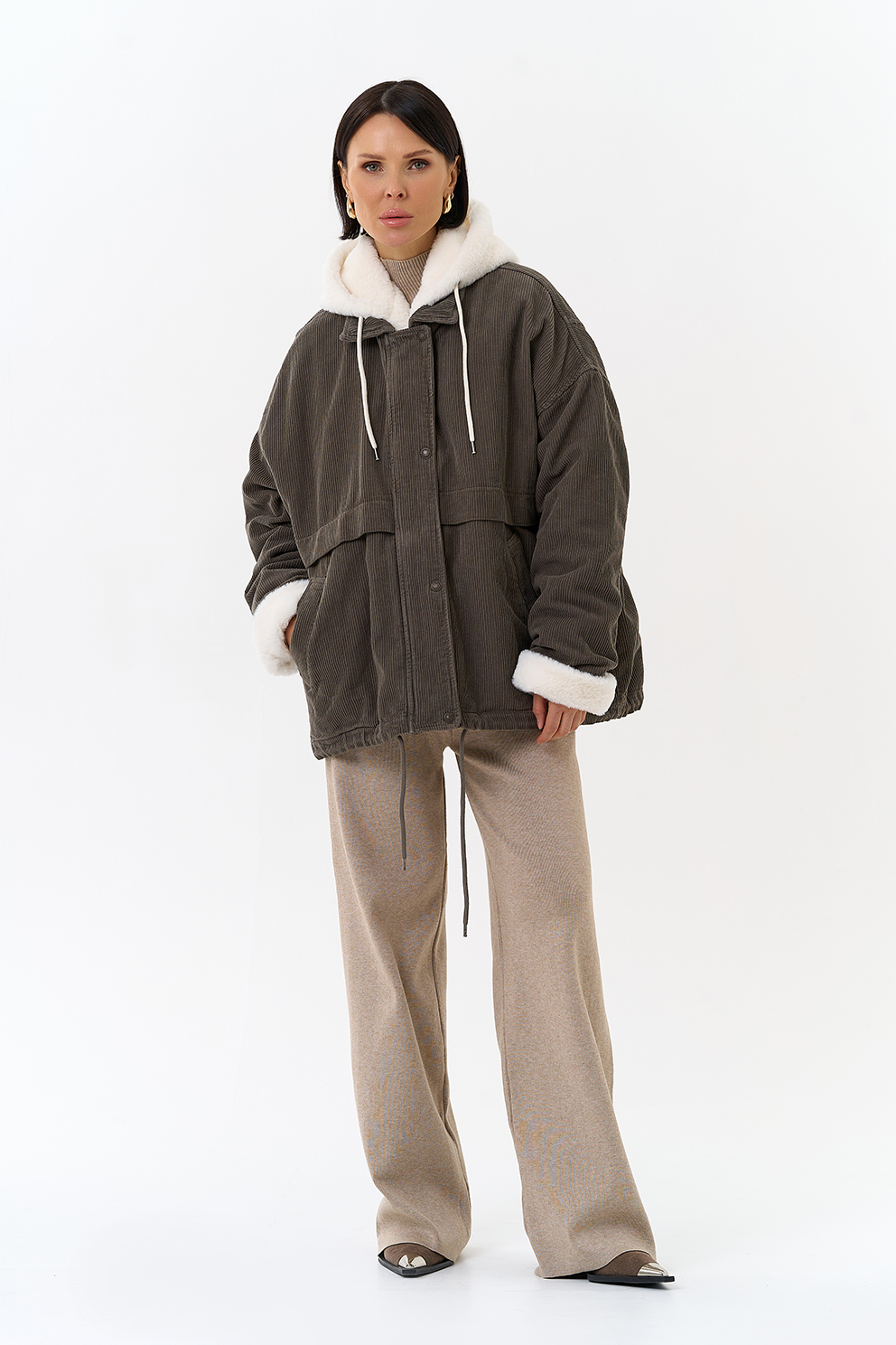 Крой воротника - съемный капюшон, отделка эко мех